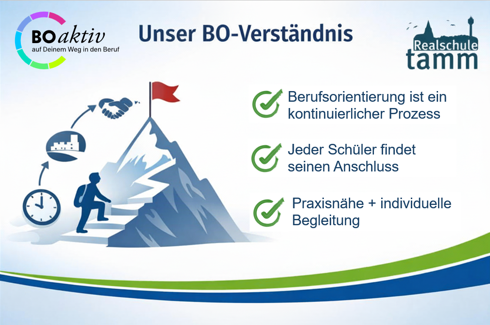 Mit BOaktiv bündelt die Realschule Tamm ihre praxisorientierten Maßnahmen in einem klar strukturierten Konzept. BOaktiv steht für die konsequente Verknüpfung von schulischem Lernen und realen Einblicken in die Arbeitswelt. Schülerinnen und Schüler erhalten vielfältige und verbindliche Gelegenheiten, berufliche Praxis kennenzulernen – durch Praxiserfahrungen, Betriebskontakte, Projekte sowie Begegnungen mit Vertreterinnen und Vertretern unterschiedlicher Berufsfelder.