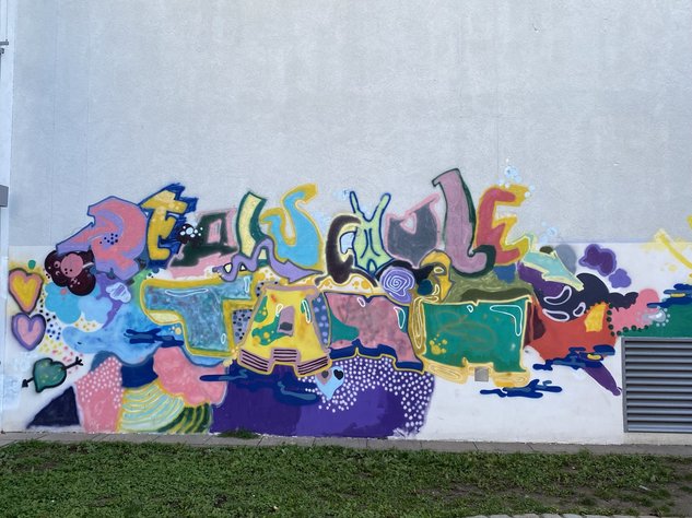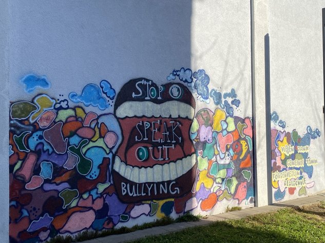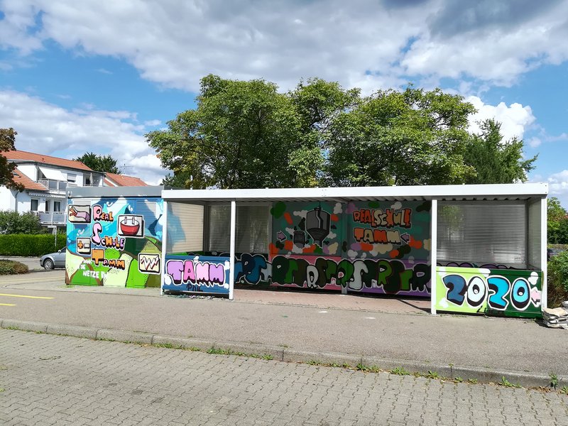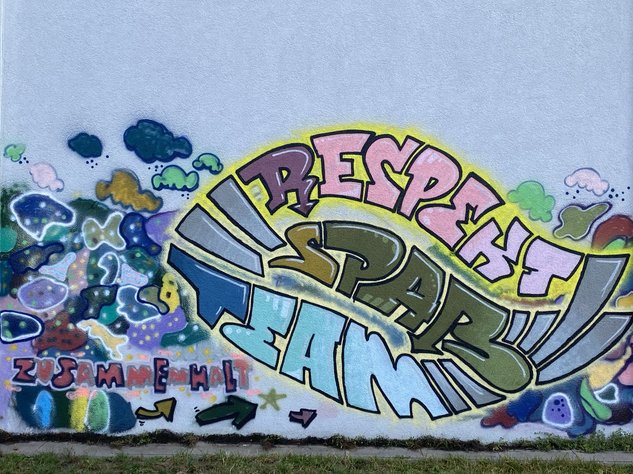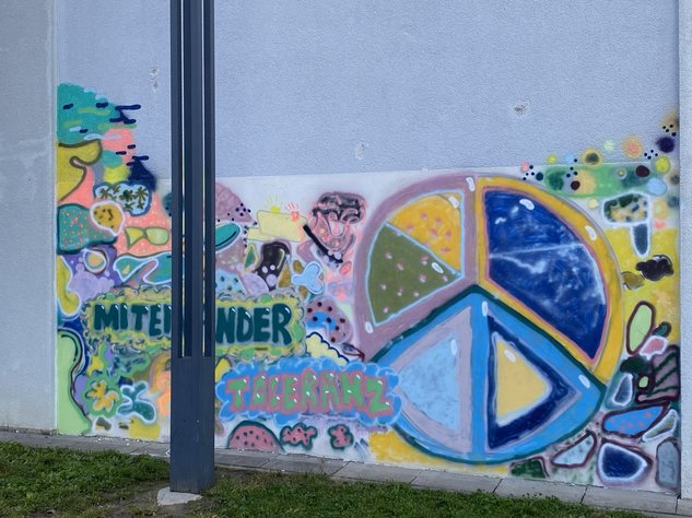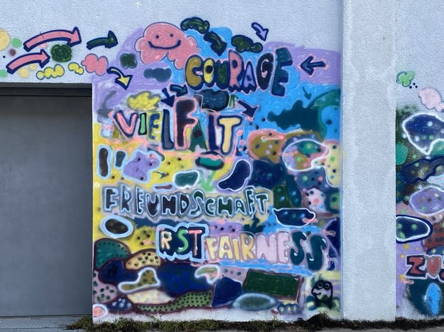 September 2021: Knapp 30 Schülerinnen und Schüler der Klasse 5 bis 10 besprühten, unter Anleitung ihres Kunstlehrers Herrn Scheu, die Fassade der Sporthalle mit Motiven und Schriftzügen zum Thema „Schule mit Courage – Schule ohne Rassismus“.
