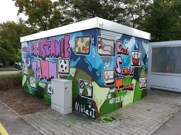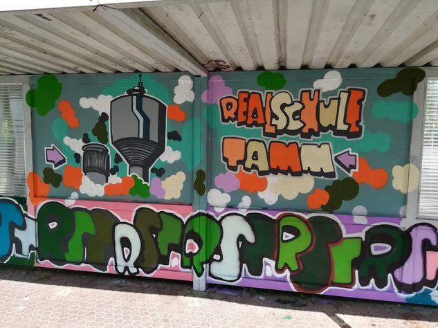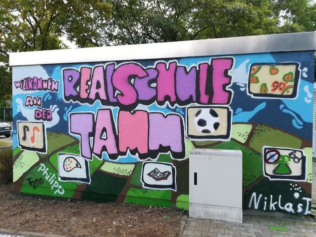 Besucher der Realschule finden unter anderem den Schriftzug „Stop Bullying – Speak Out“ und ein überdimensionales „Peace“ Zeichen im Gemälde der Schüler wieder. Unterstützt wurde das Projekt von der Gemeinde Tamm, der Bürgerstiftung der Volksbank und dem Förderverein der Realschule.