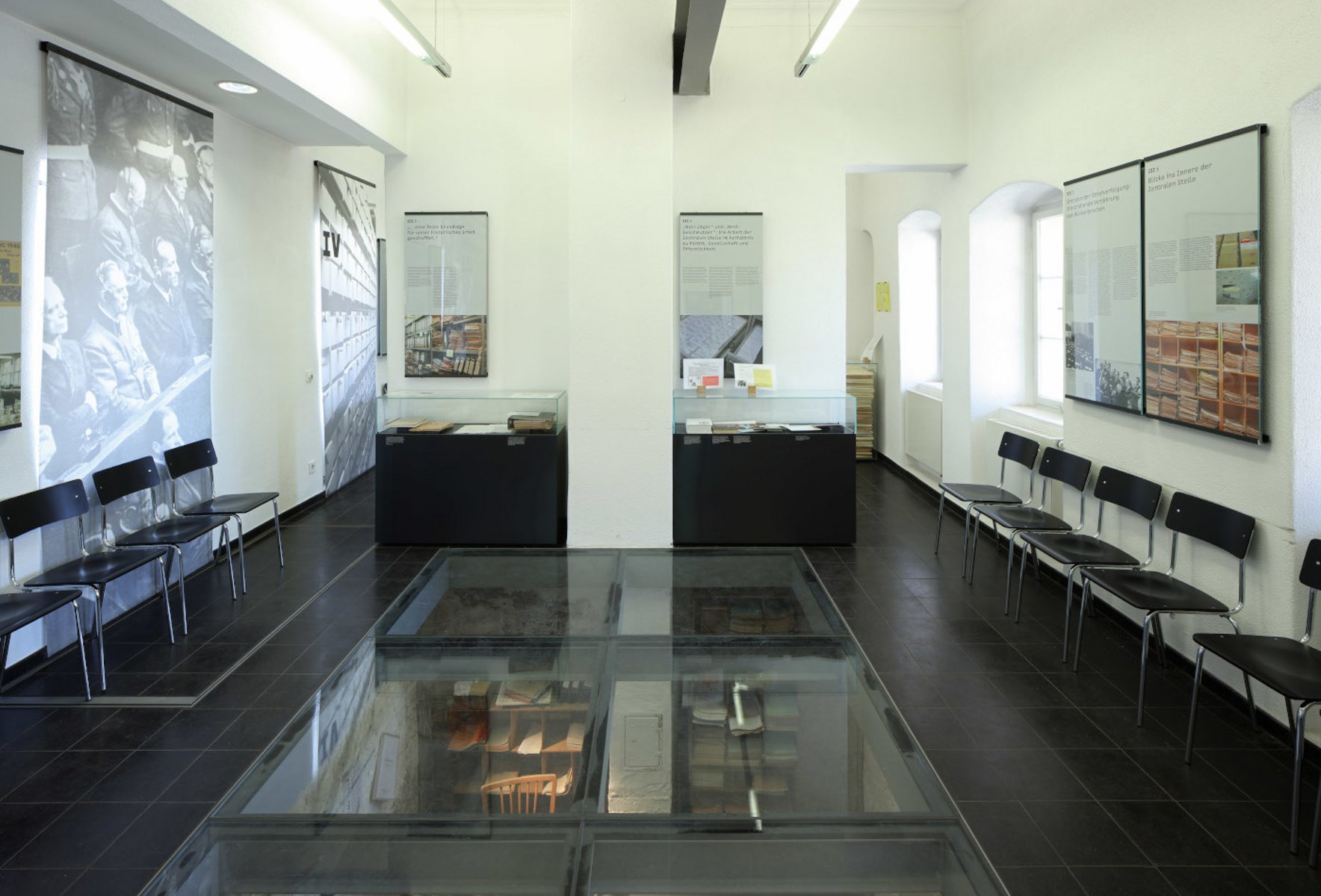 Der Besuch begann mit einem Besuch im angrenzten Schorndorfer Torhaus. Hier präsentiert das Bundesarchiv die Ausstellung "Die Ermittler von Ludwigsburg". Im zentralen Ausstellungsraum vermittelt ein auf einem gläsernen Boden begehbarer Arbeitsplatz einen Eindruck von den Arbeitsbedingungen der „Ermittler von Ludwigsburg“ nach 1959.
