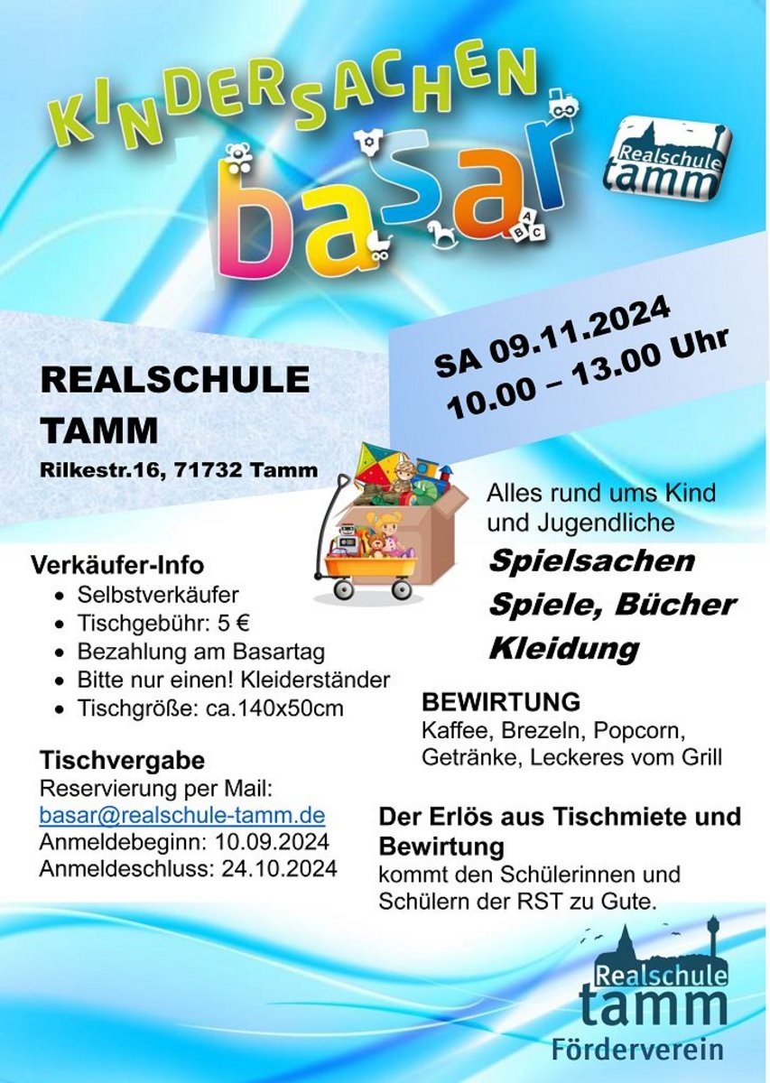 Am 09.11.2024 findet zum zweiten Mal ein Selbstverkäufer-Kinderbasar an der Realschule Tamm statt, zu dem wir Sie herzlich begrüßen möchten. Für das leibliche Wohl ist mit Kaffee, Brezeln, Popcorn, Getränken und Leckerem vom Grill bestens gesorgt.