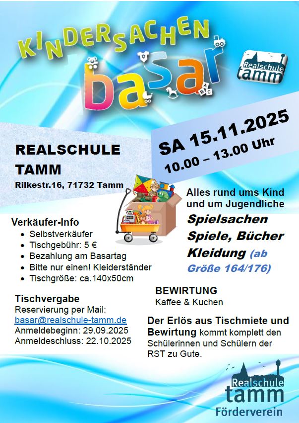 Am Samstag 15.11.2025 findet zum viertenMal ein Selbstverkäufer-Kinderbasar an der Realschule Tamm statt, zu dem wir Sie herzlich begrüßen möchten. Für das leibliche Wohl ist mit Kaffee, Brezeln, Popcorn, Getränken und Leckerem vom Grill bestens gesorgt.